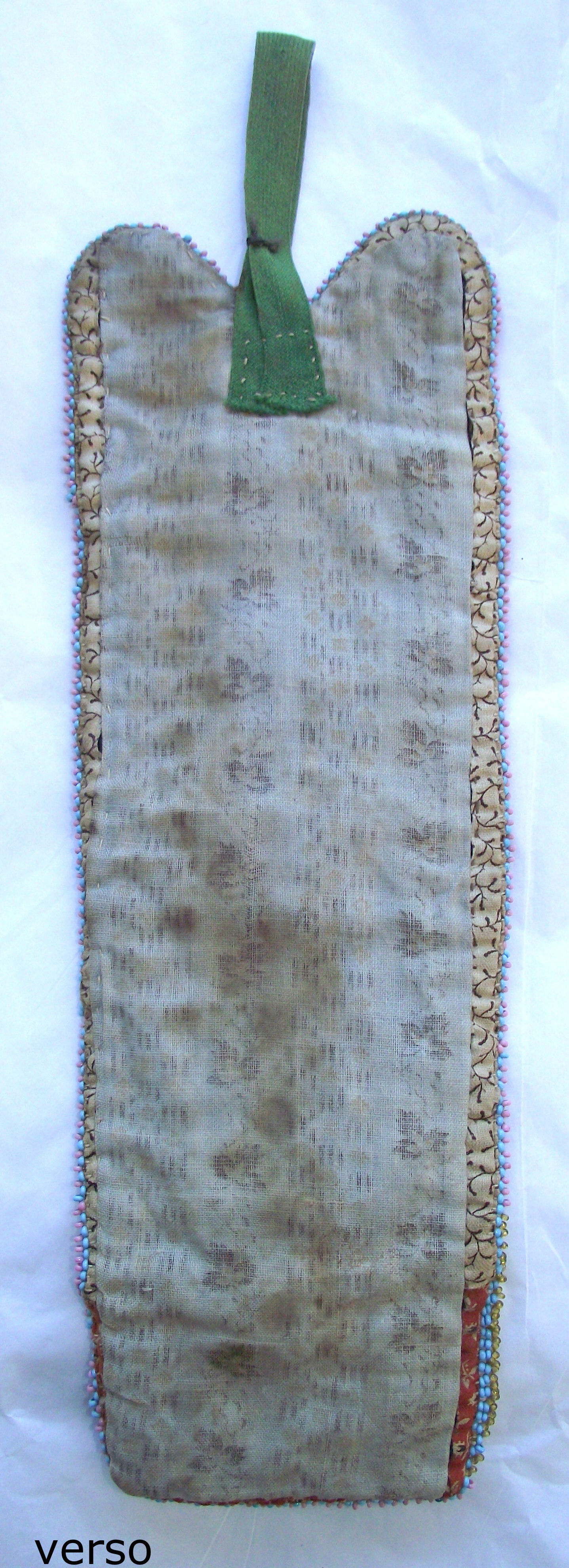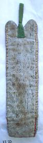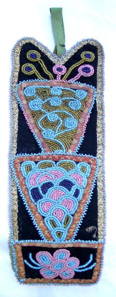 c. 1890-1900 Cree match holder/wall pocket on navy wool stroud with printed cotton backing and edge lining. Overall excellent condition with one small hole in stroud - see photo. Measures: 11.5 inches long by 3.5 inches wide (13.5 inches long with wool tab) Price: SOLD AMH-001-012 |
