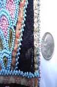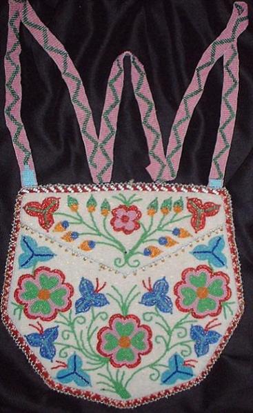 Woodlands Cree, possibly Athapaskan, bag elaborately beaded in spot and couch based on the shape of early game bags. Maroon silk edging, moose or caribou hide backing. Striped pillow tick lining. Measures: 9.25 inches high by 10.25 inches wide. Loomed strap measures 46 inches long. Magnificent example of c. 1900-1925 First Nations bead work. Price on Request (SB-002) |