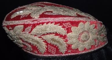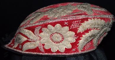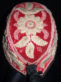 Seneca Glengarry Cap c. 1860 Encrusted with clear glass beads, this cherry red velvet Glengarry cap captures the essence of the Holiday Season. The original lining is plaid silk. SOLD (GG2-13) |